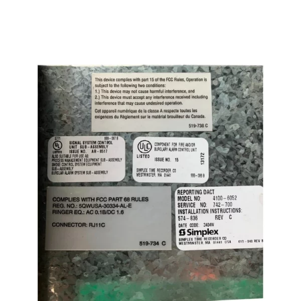 The Simplex 4100-6052 Serial Digital Alarm Communicator Transmitter (DACT) provides advanced monitoring and event reporting for Simplex fire alarm control panels. Designed to support Central Station communication, the 4100-6052 ensures critical status updates—including alarms, trouble signals, and supervisory conditions—are promptly transmitted for timely emergency response.